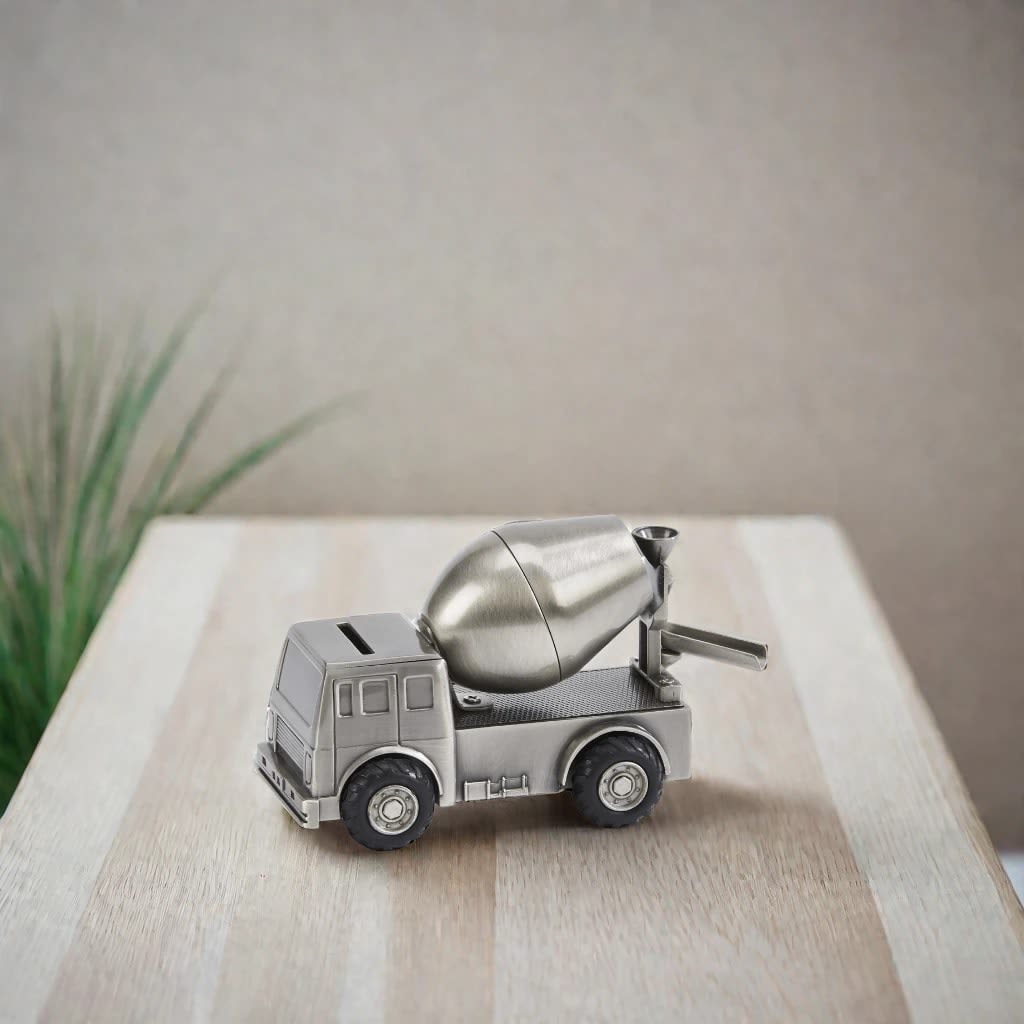 Mix up the savings with our cement mixer bank! Our cement mixer bank is manufactured in a non-tarnish, brushed pewter finish and is crafted with amazing details including working rubber tires. The coin slot is located on the roof. Overall dimensions are 3.5" H x 2.75" W x 5" L. Gift boxed.