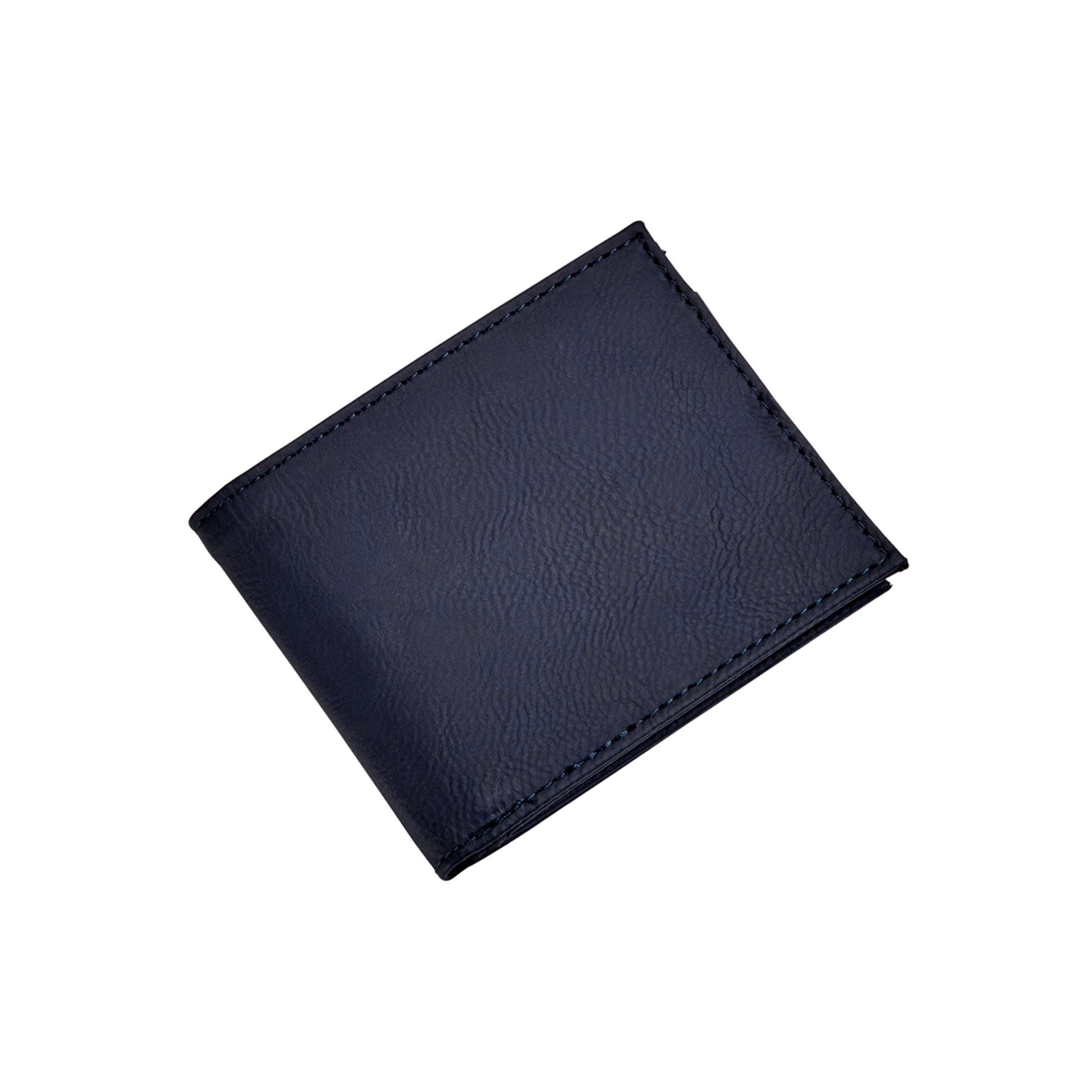 Our Bi-Fold Leatherette Navy Wallet provides a place for everything that you need to carry. It includes a split billfold area to keep large bills separate from small bills or receipts, 5 slots to place items such as credit cards, business cards or other ID's, a Flip up ID Window with Thumb Hole as well as 2 open pockets. The wallet measures 4.5" X 3.75" when folded. The grey leatherette laser engraves very nicely and the engraving shows up as black when engraved. Gift boxed.