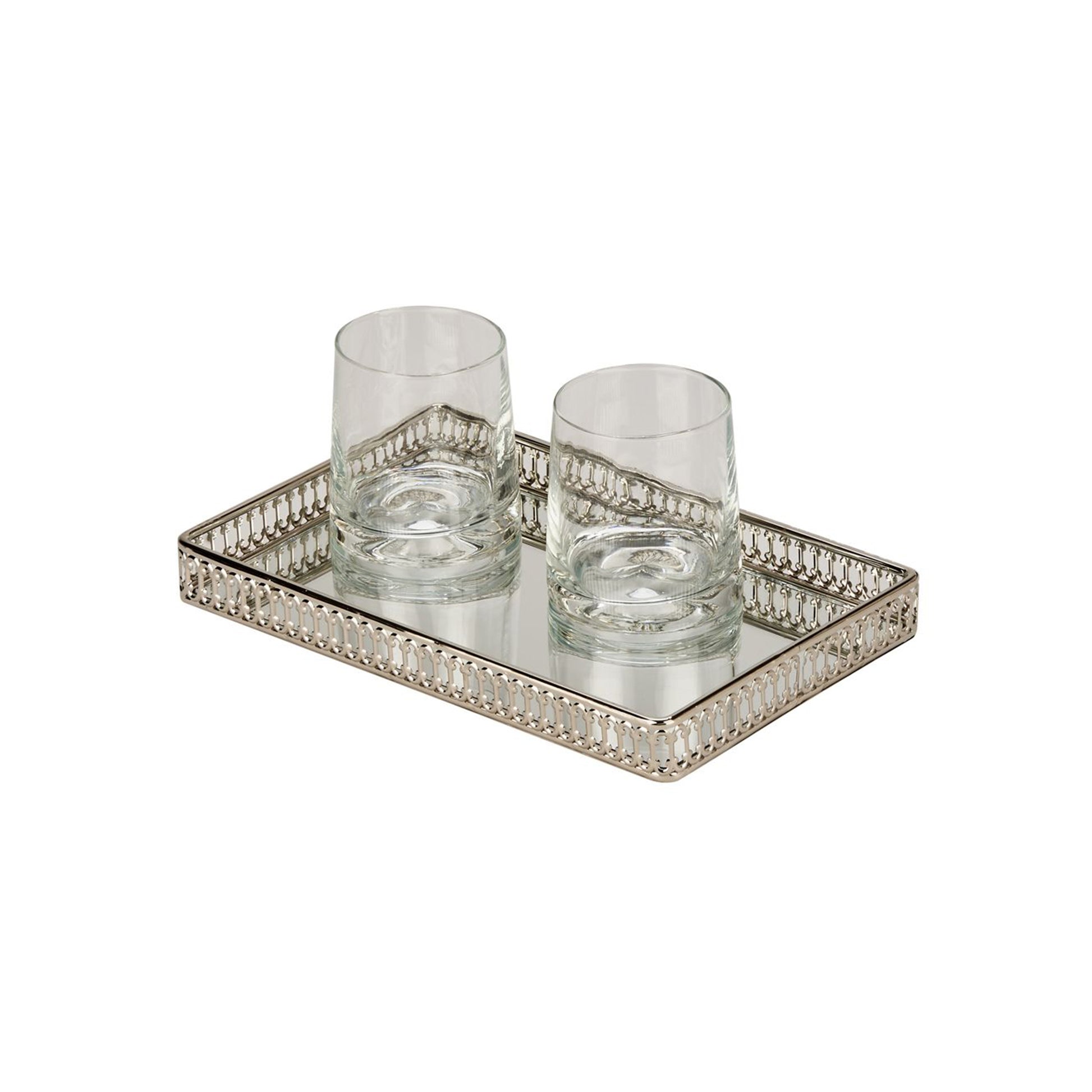 Add a touch of refinement to your home with our Mirror Vanity Gallery Tray. This tray melds functionality with decorative flair, featuring a nickel-plated silver border that resists tarnishing and a mirrored base that amplifies its sophisticated look. Measuring 11" L x 7" W x 1.5" H, it's perfectly sized for serving guests or stylishly organizing vanity items. Whether used in the dining room or on a dresser, it’s an ideal choice for a housewarming or wedding gift, and arrives beautifully packaged in a gift box.